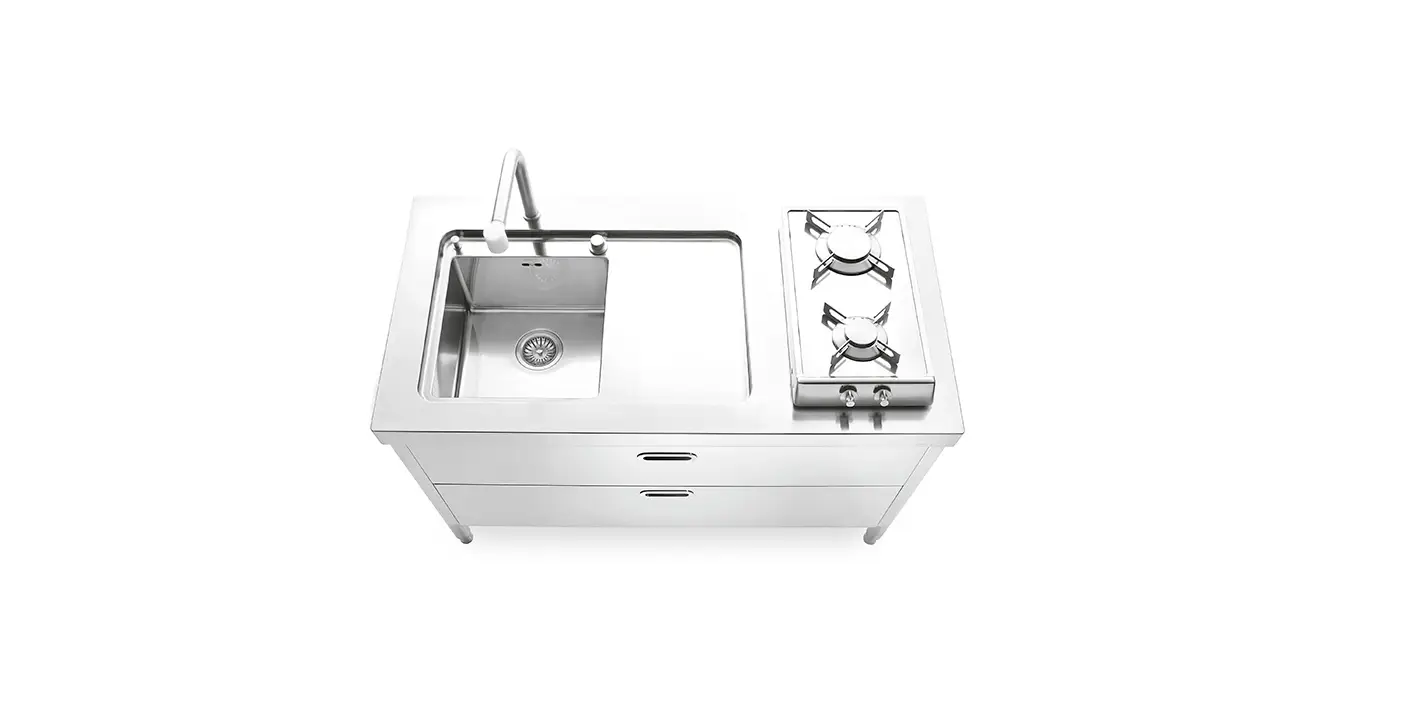 Das Spül- und Kochelement kann unterschiedlich ausgestattet werden: mit vier 60cm Schubladen, mit zwei 60cm Türen oder mit Geschirrspüler und 60cm Backofen. In das Element können verschiedene Becken, Spülen, Armaturen und Kochfelder integriert werden.