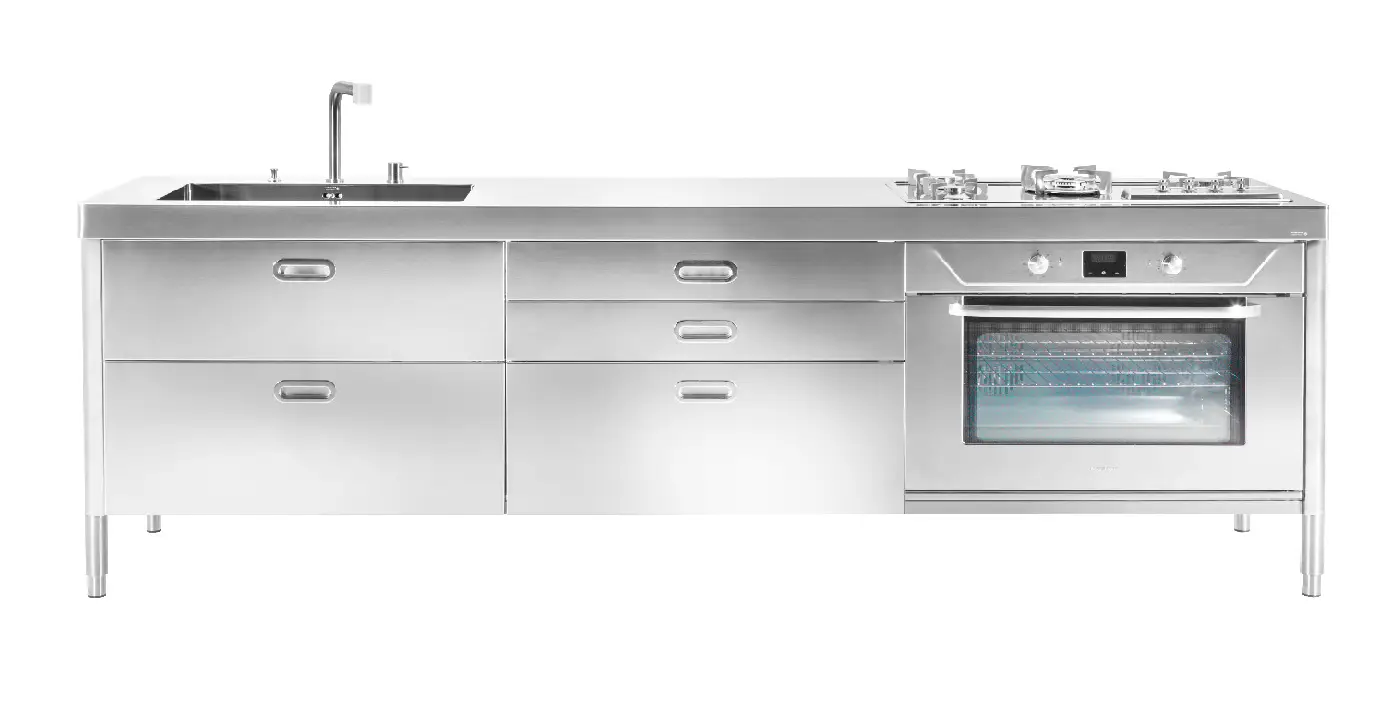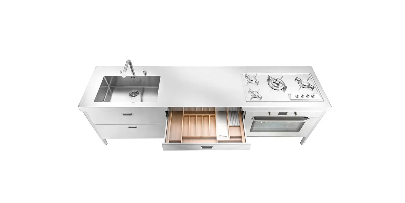 Das Spül- und Kochelement kann unterschiedlich ausgestattet werden: mit Türen und Schubladen unterschiedlicher Größe oder mit 60cm Backofen. In das Element können verschiedene Becken, Spülen, Armaturen und Kochfelder integriert werden.